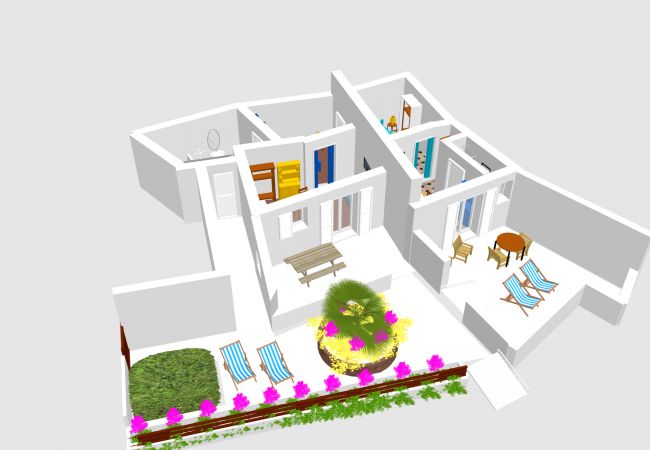 The terrace with a beautiful view of the sea is approximately 50 m² in size, decorated in a Mediterranean style and equipped with table, chairs and deck chairs and partly sheltered by a straw.
